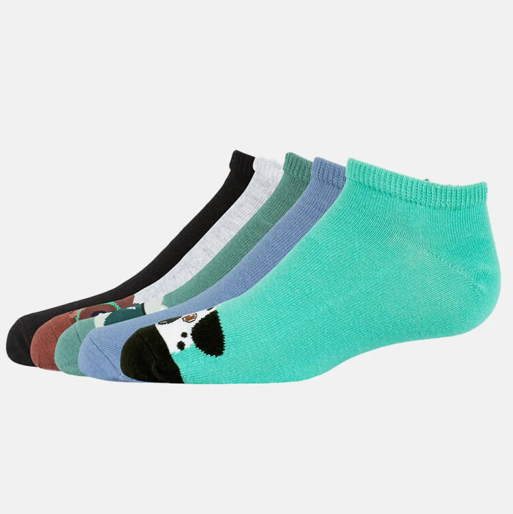 5-pakning ankelsokker i økologisk bomull med morsomt dyreprint! Gode hverdagssokker som sitter godt på foten, perfekt til vårens sneakers hvor sokkene ikke synes.