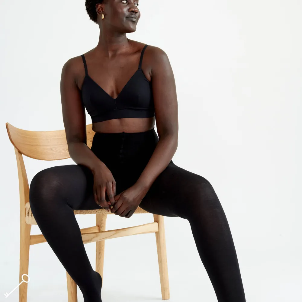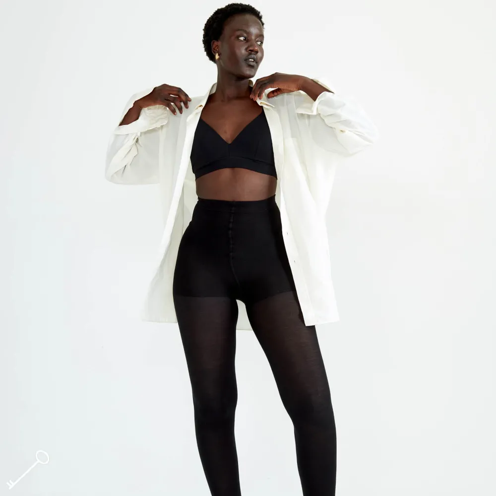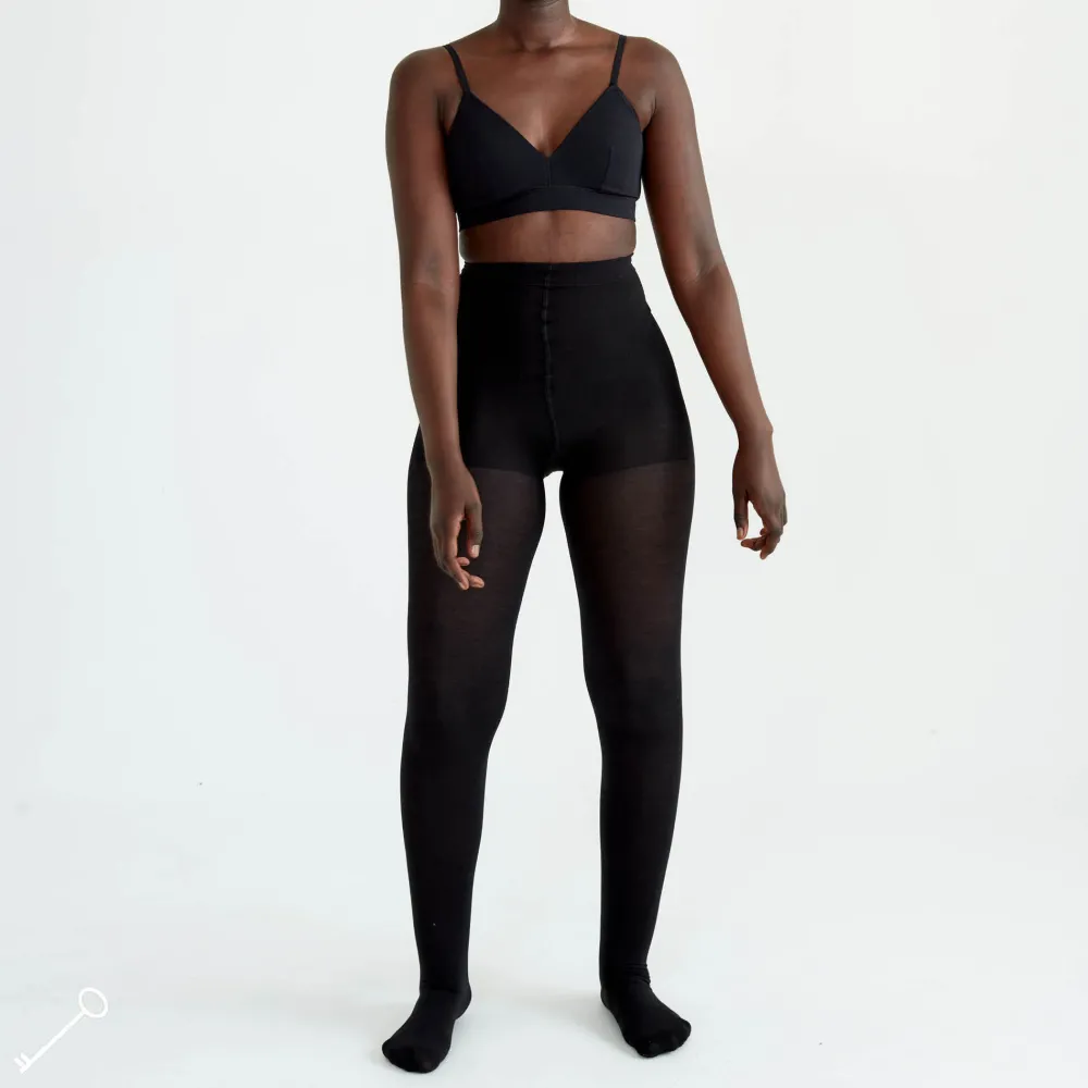 Wool hold-in tights, designet for å gi støtte og holde deg varm. Former og støtter midjen, hoftene og lårene dine, med en supermyk merinoblanding. Disse tightsene har en høykvalitets, matt finish, en myk linning og en bomullskile. Laget for å brukes om igjen.
