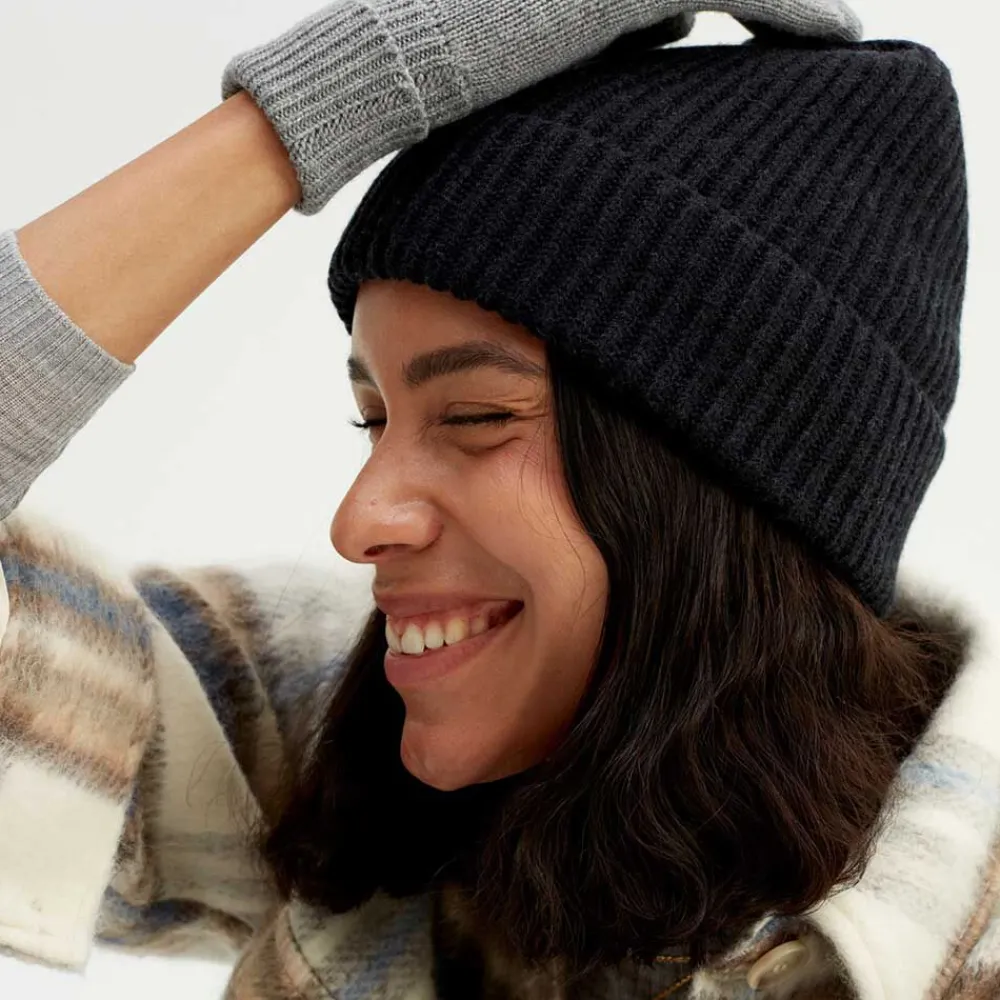 Ribbestrikket lue i 55% myk Svanemerket merinoull og 45% viskose som holder hodet varmt. Brettekant nederst.