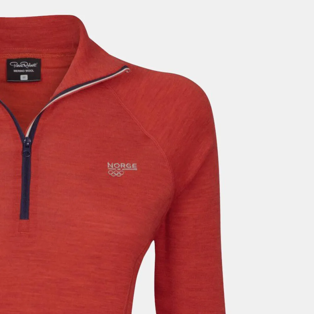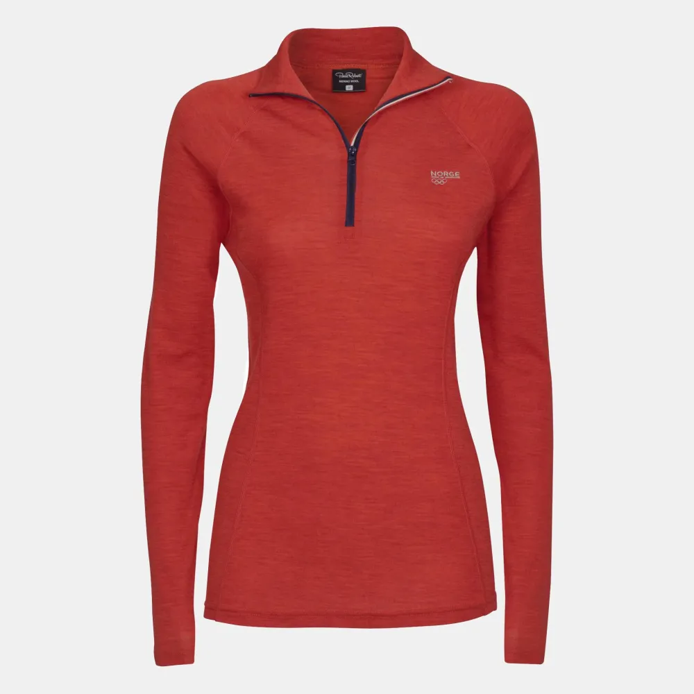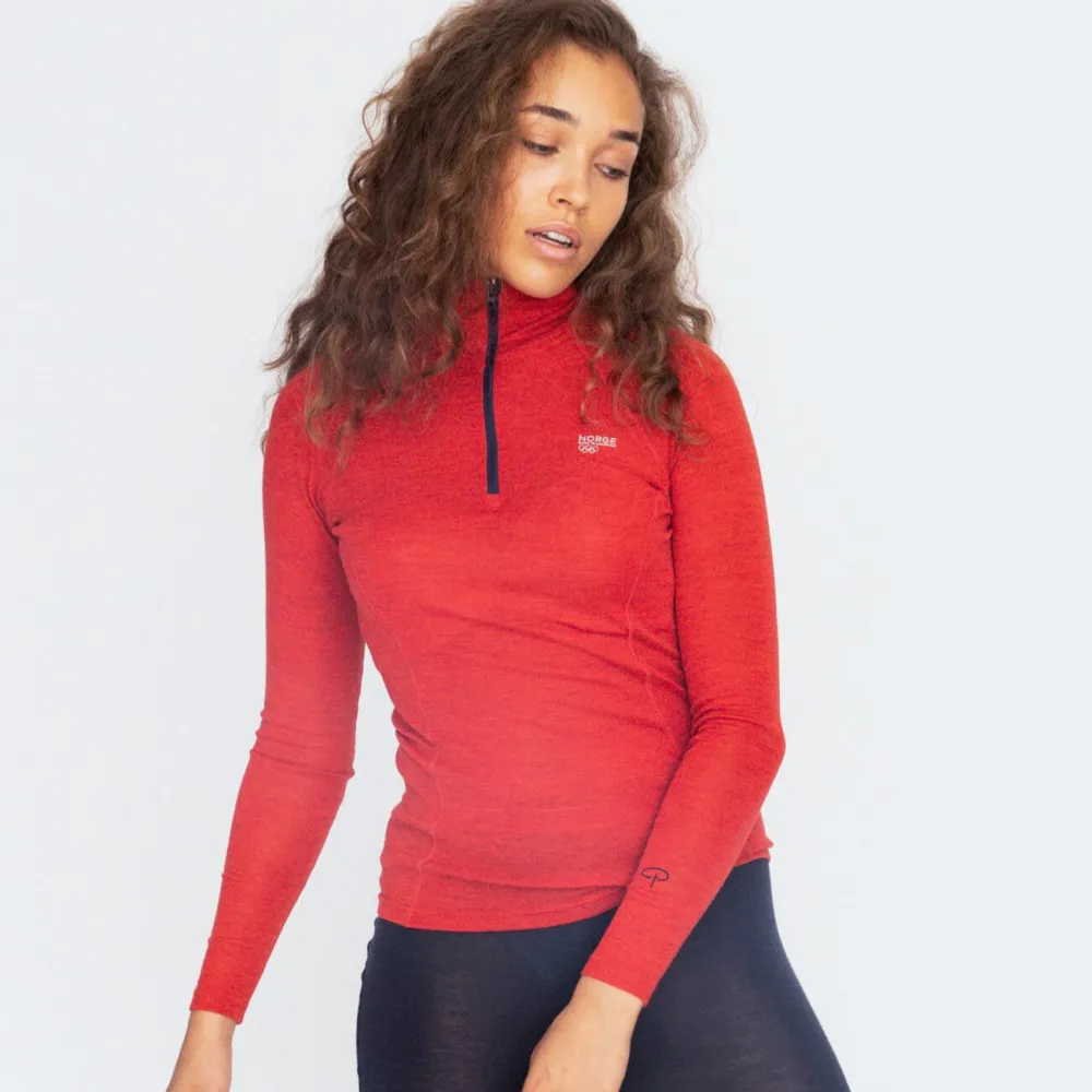 Svanemerket ulltrøye til dame med zip i merinoull og naturmaterialet Tencel (Black Mel., Olive Melange, Light Mahogny) / resirkulert polyester (Khaki, OL Navy, OL Red Mel.). Materialkombinasjonen transporterer fukt og holder deg tørr både under og etter trening. Figursydd med flatterende snitt og ekstra langt liv, som hindrer at den glir opp rundt midjen. Glidelåsen i halsen gjør det lett å regulere temperaturen.